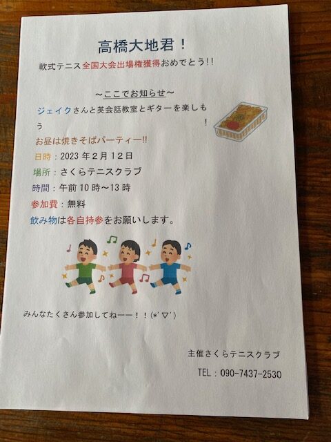 全国大会出場権!軟式テニスは小学校最後の試合です。中学校からは硬式テニスに専念します。さくらテニスクラブのモットーは一人一人の個性を伸ばすことです、このチラシは小学6年生の高木華菜さんがPCを使い作ってくれました!彼女も軟式テニスを頑張ってます!ありがとう~。